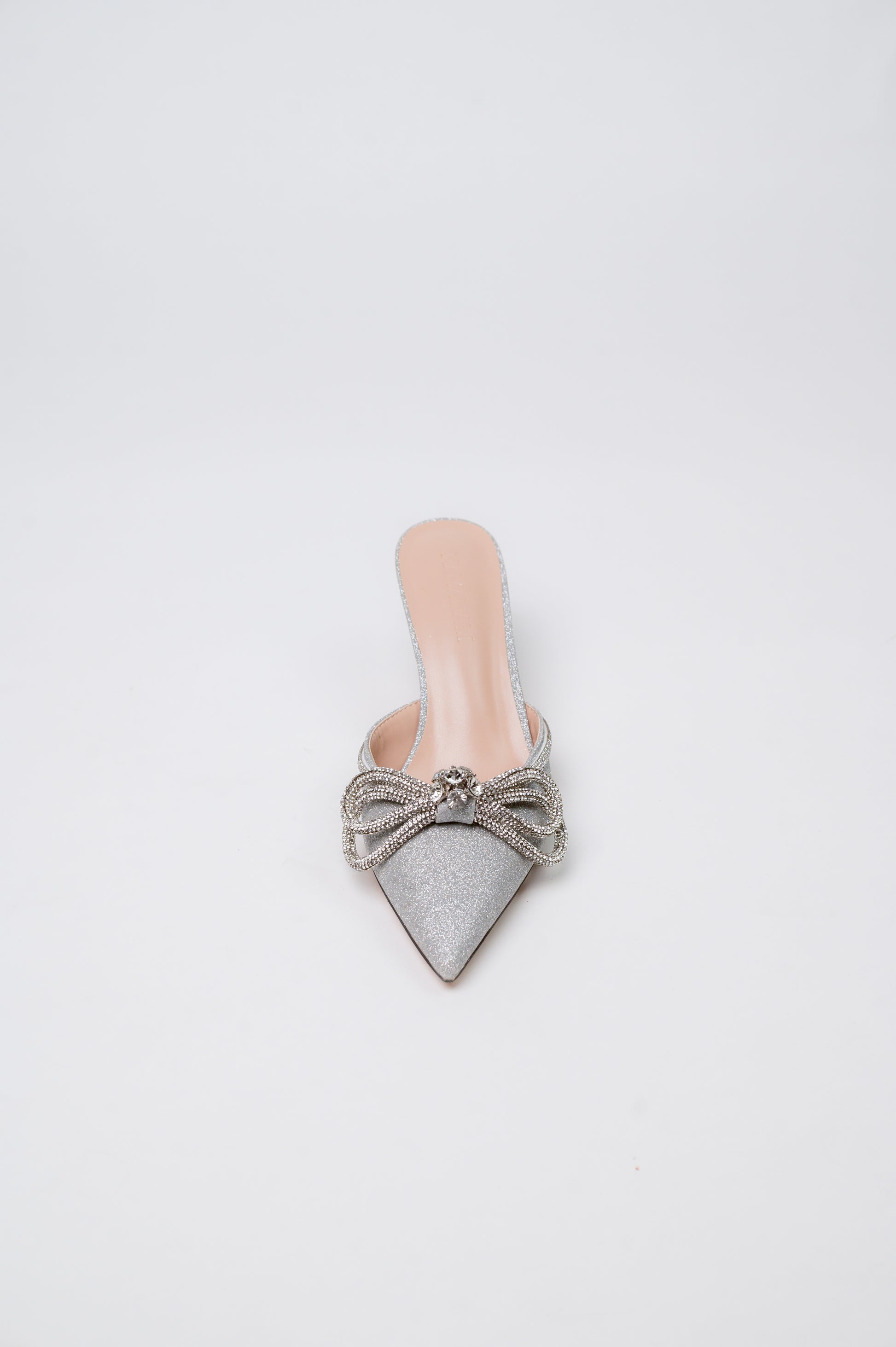 A pointed-toe mule with a diamond ribbon detail that enhances a feminine and slimming effect.