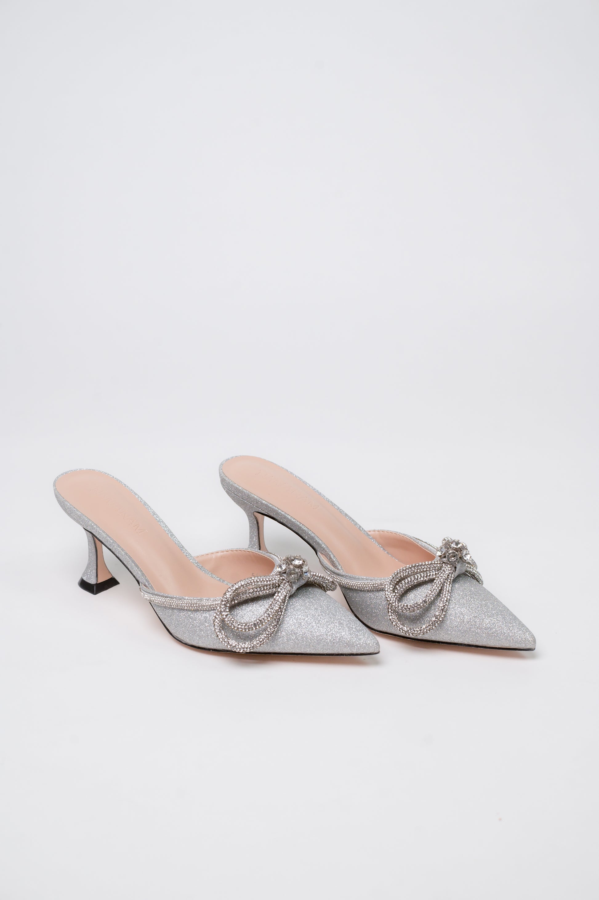 Gemini Ribbon Heeled Mules Silver