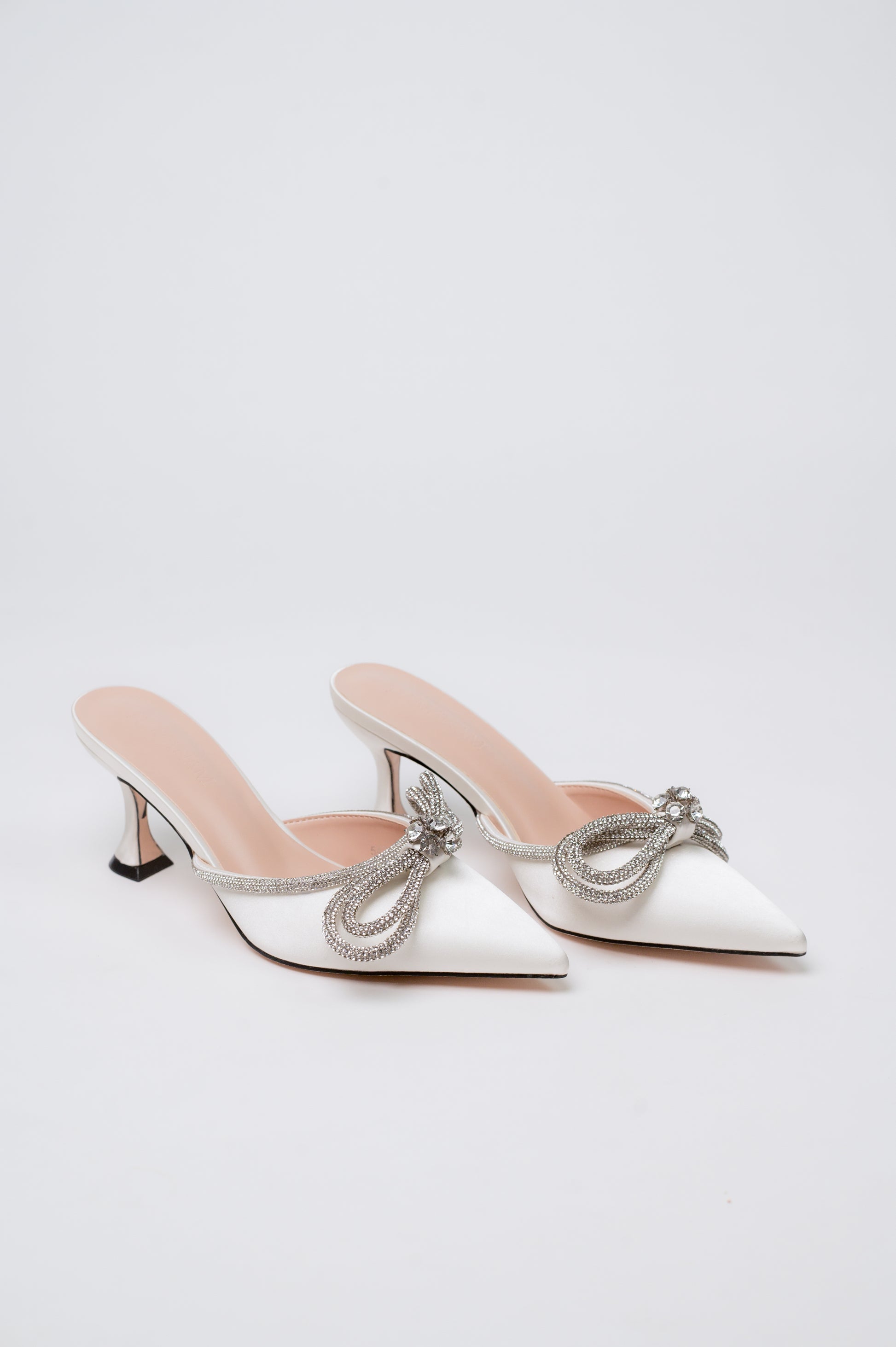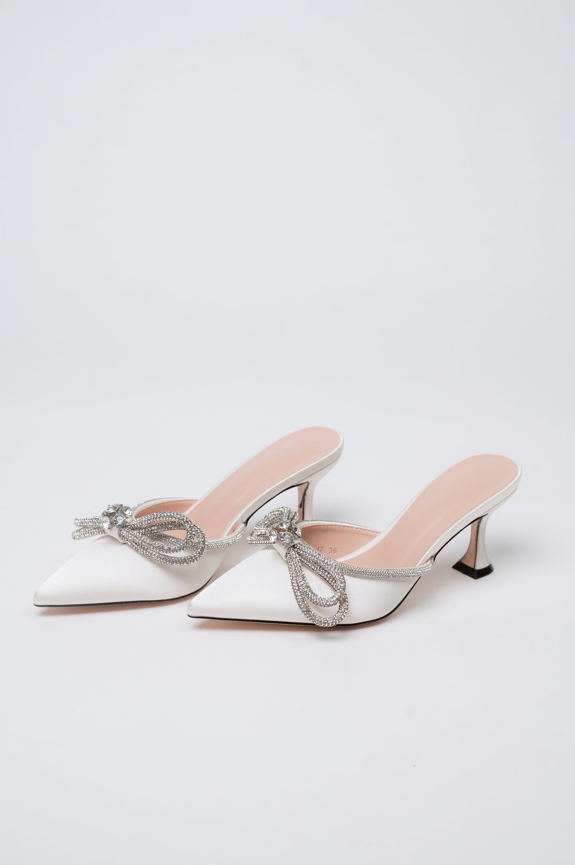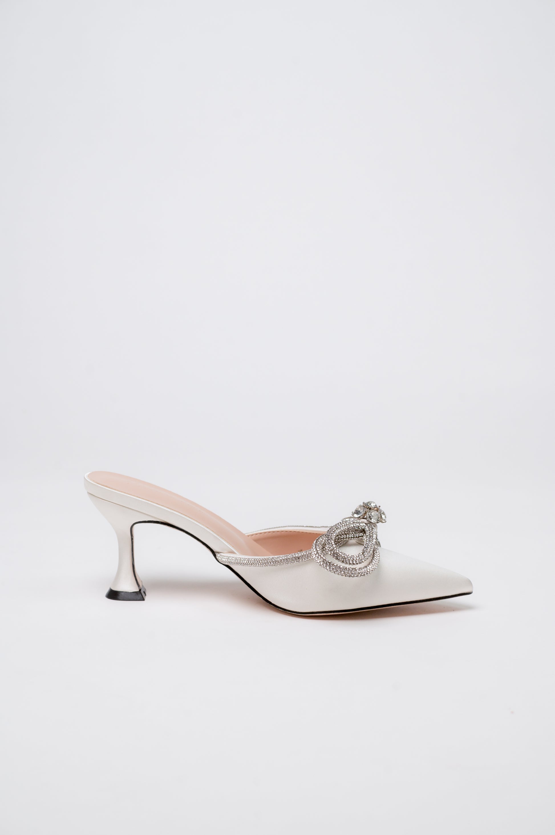 A pointed-toe mule with a diamond ribbon detail that enhances a feminine and slimming effect.