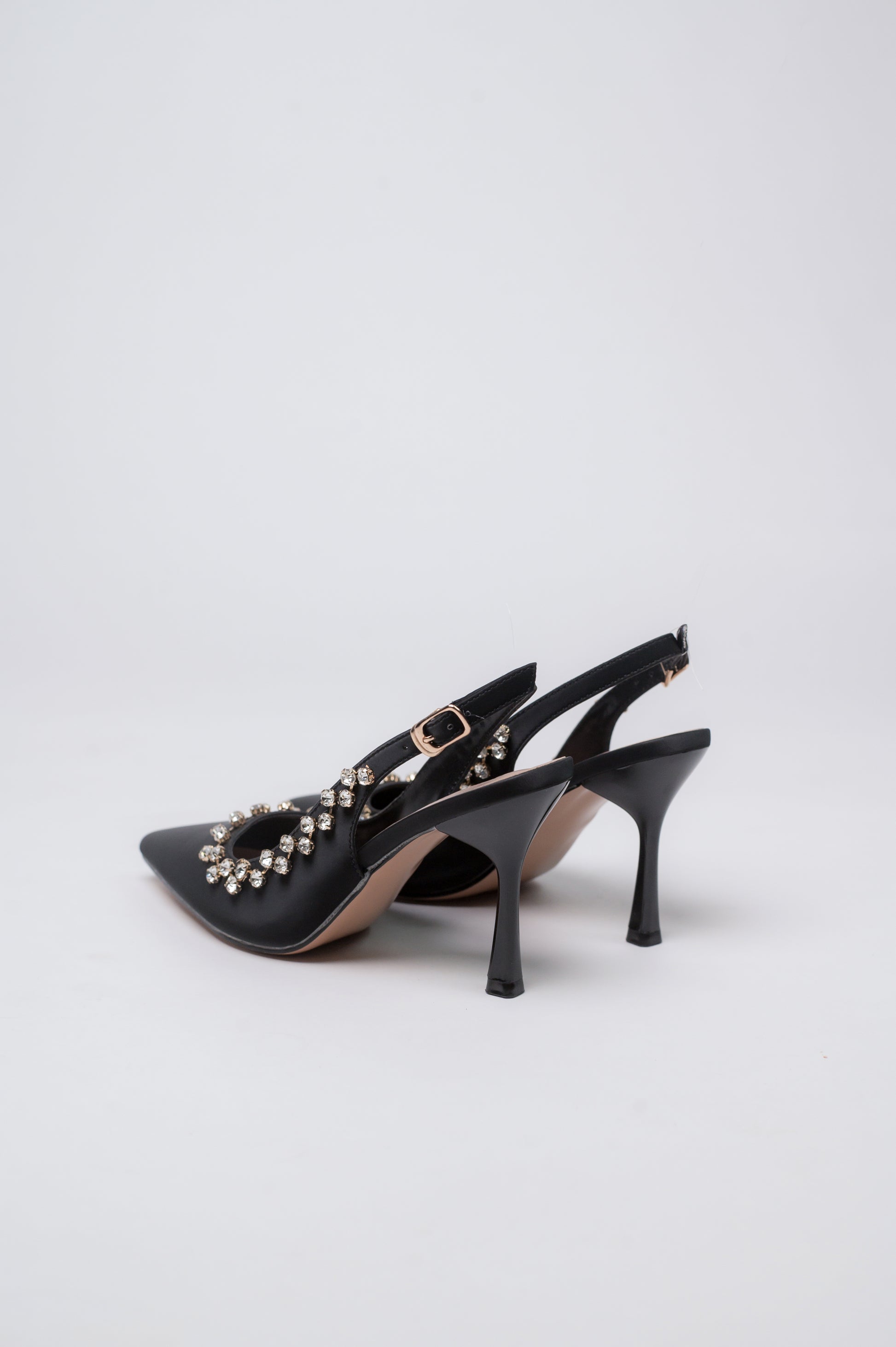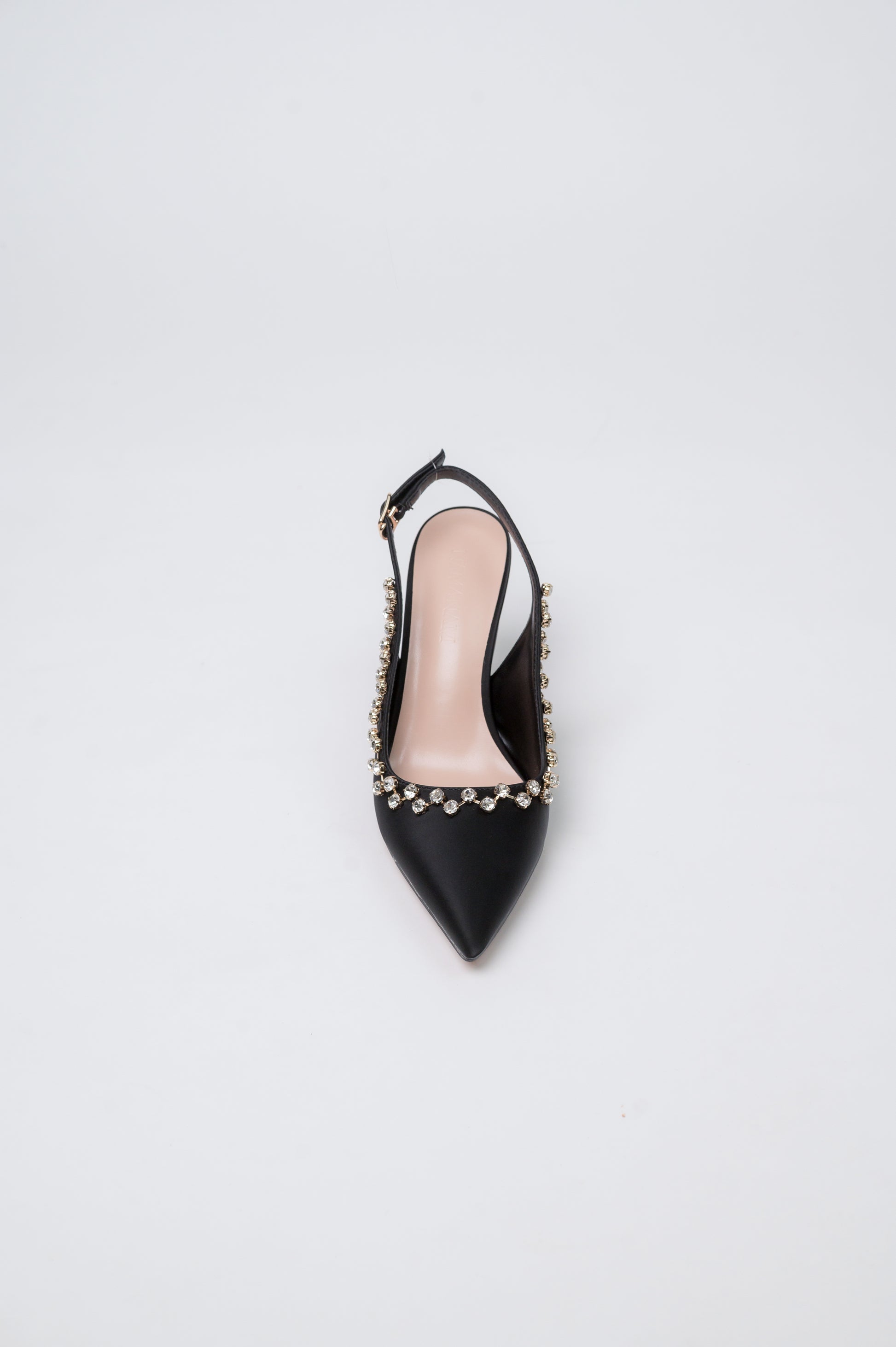 These elegant slingback heels are the epitome of refined luxury. Each pair is adorned with a delicate crystal chain along the edge, offering a touch of glamour to any outfit. The pointed toe and slender stiletto heel create a sleek silhouette that enhances your natural grace.