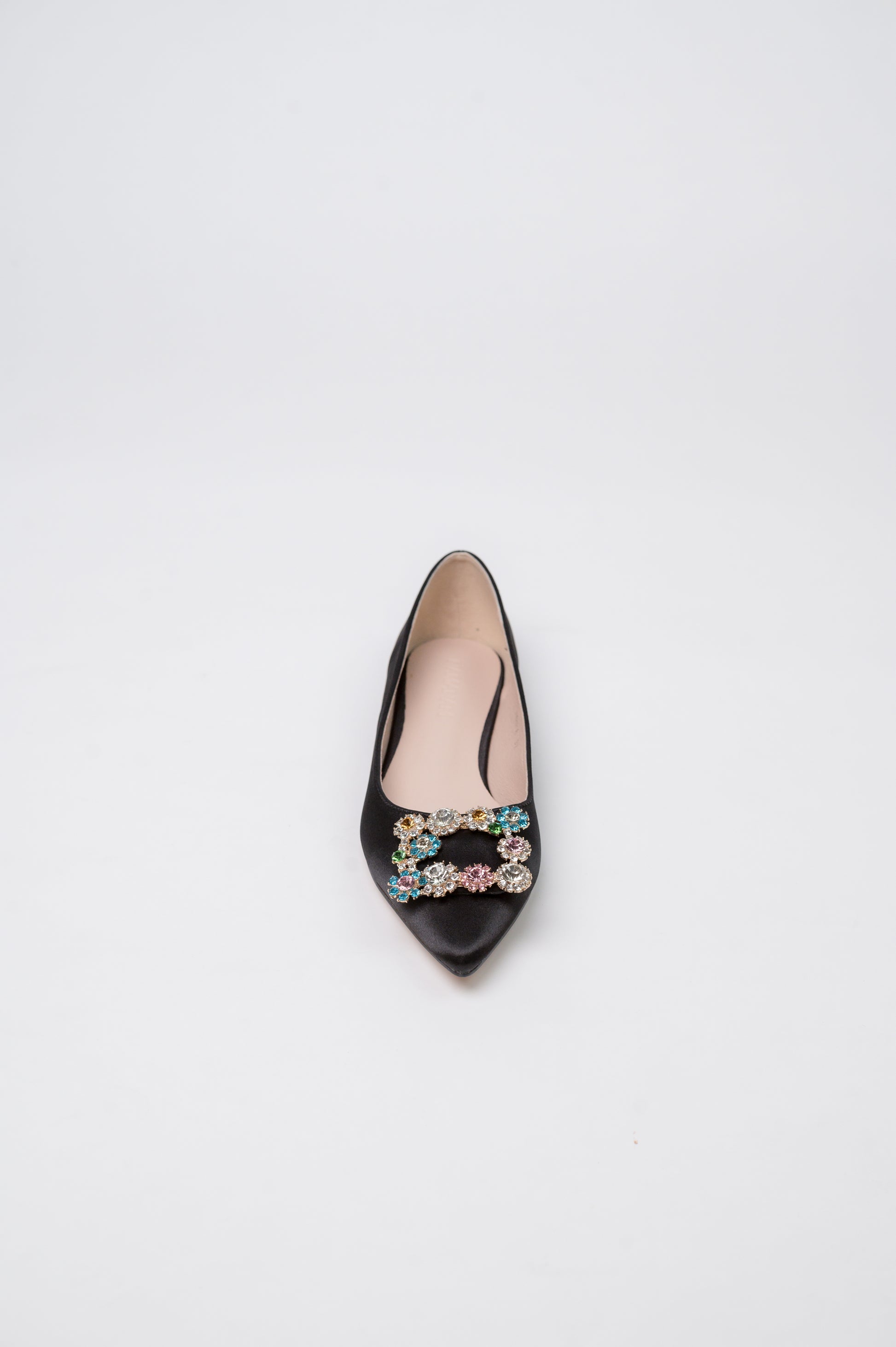 Flats are making a comeback, and we wanted to offer up a flat version of our best-selling MARQUISE. Flower crystal buckle, satin outside, suede leather inside for easy toss-on-and-go vibes. We love how scooped out this shoe is, adding a little glamour to this flat moment!