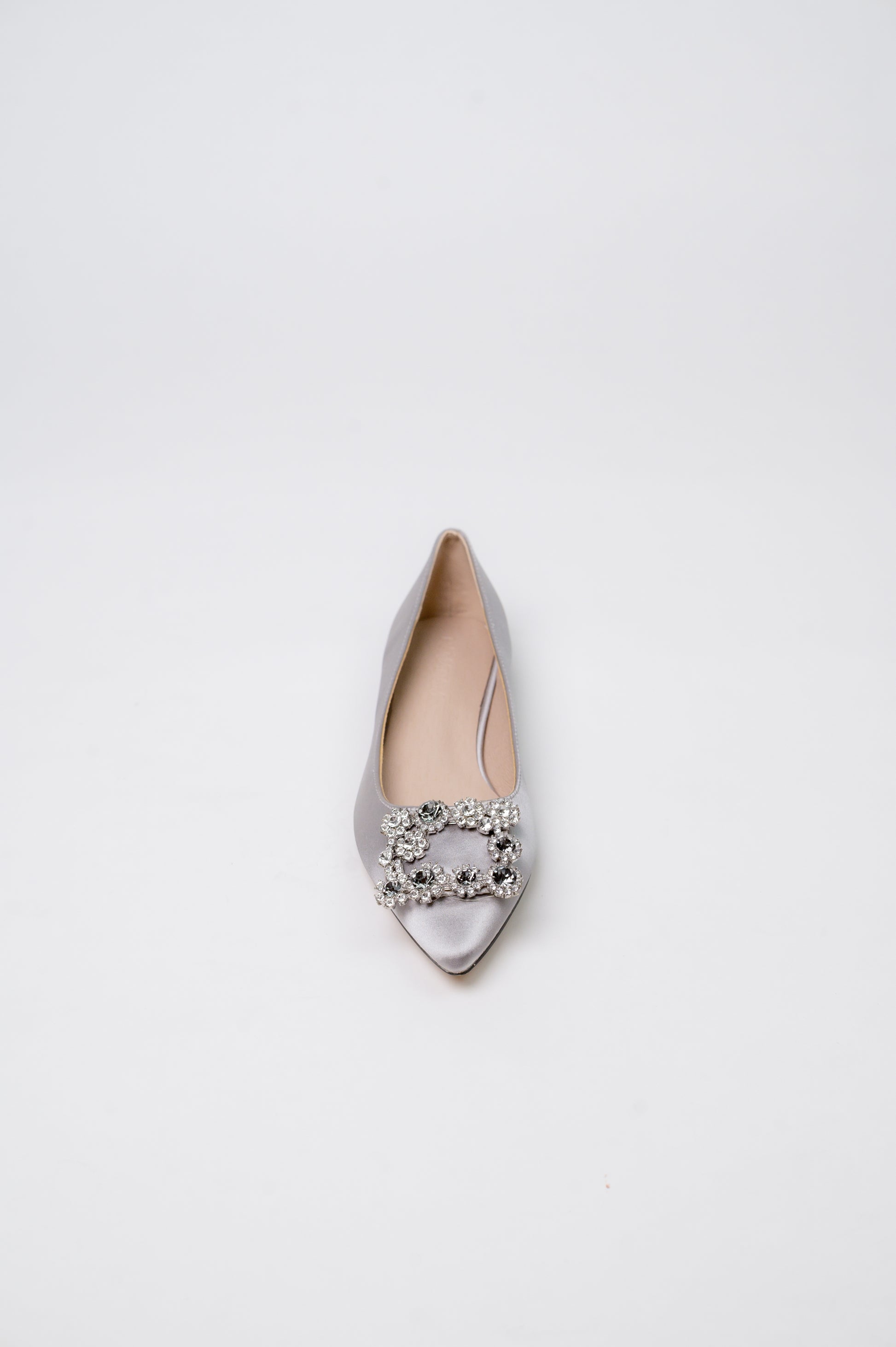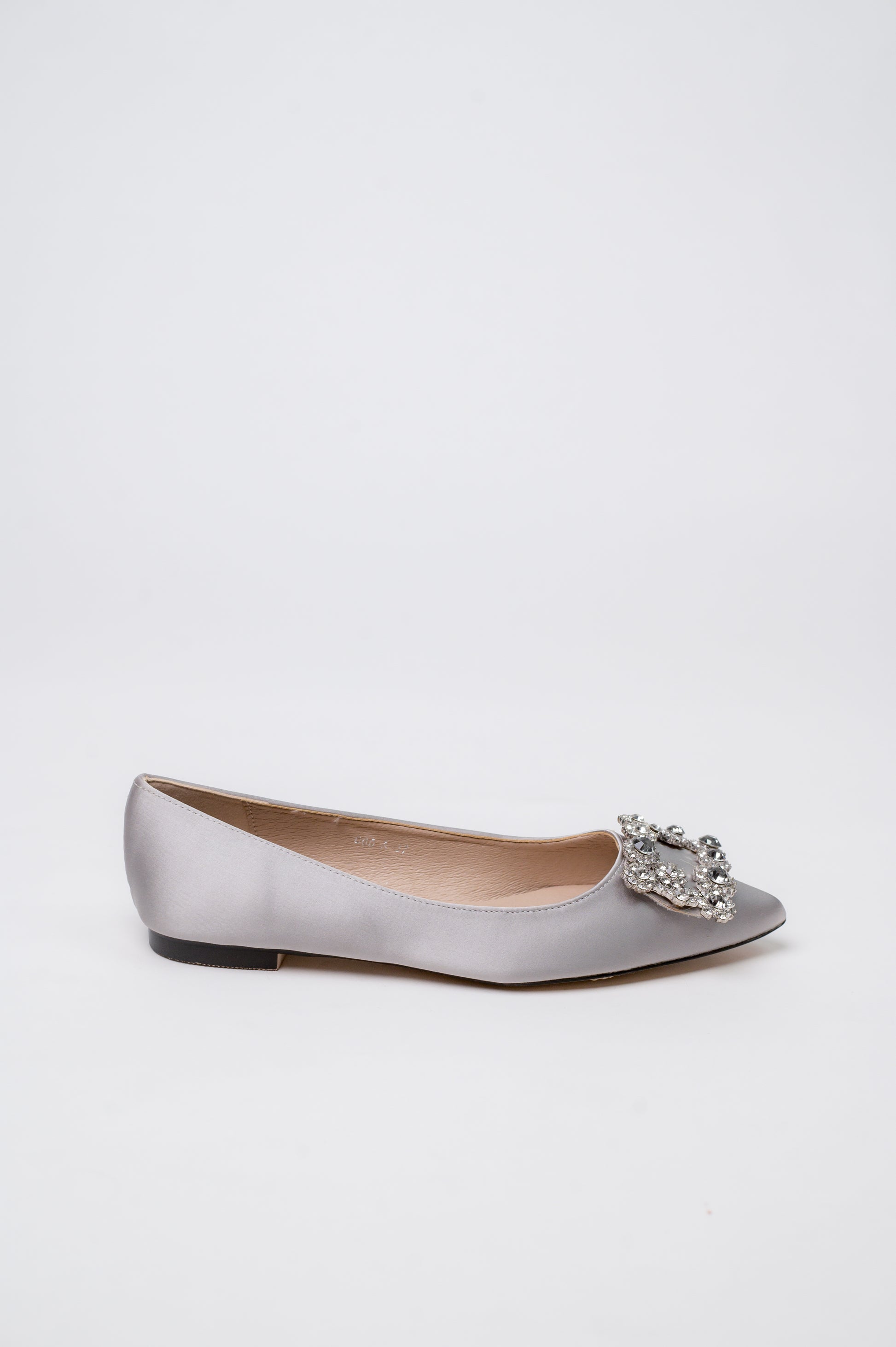 Flats are making a comeback, and we wanted to offer up a flat version of our best-selling MARQUISE. Flower crystal buckle, satin outside, suede leather inside for easy toss-on-and-go vibes. We love how scooped out this shoe is, adding a little glamour to this flat moment!