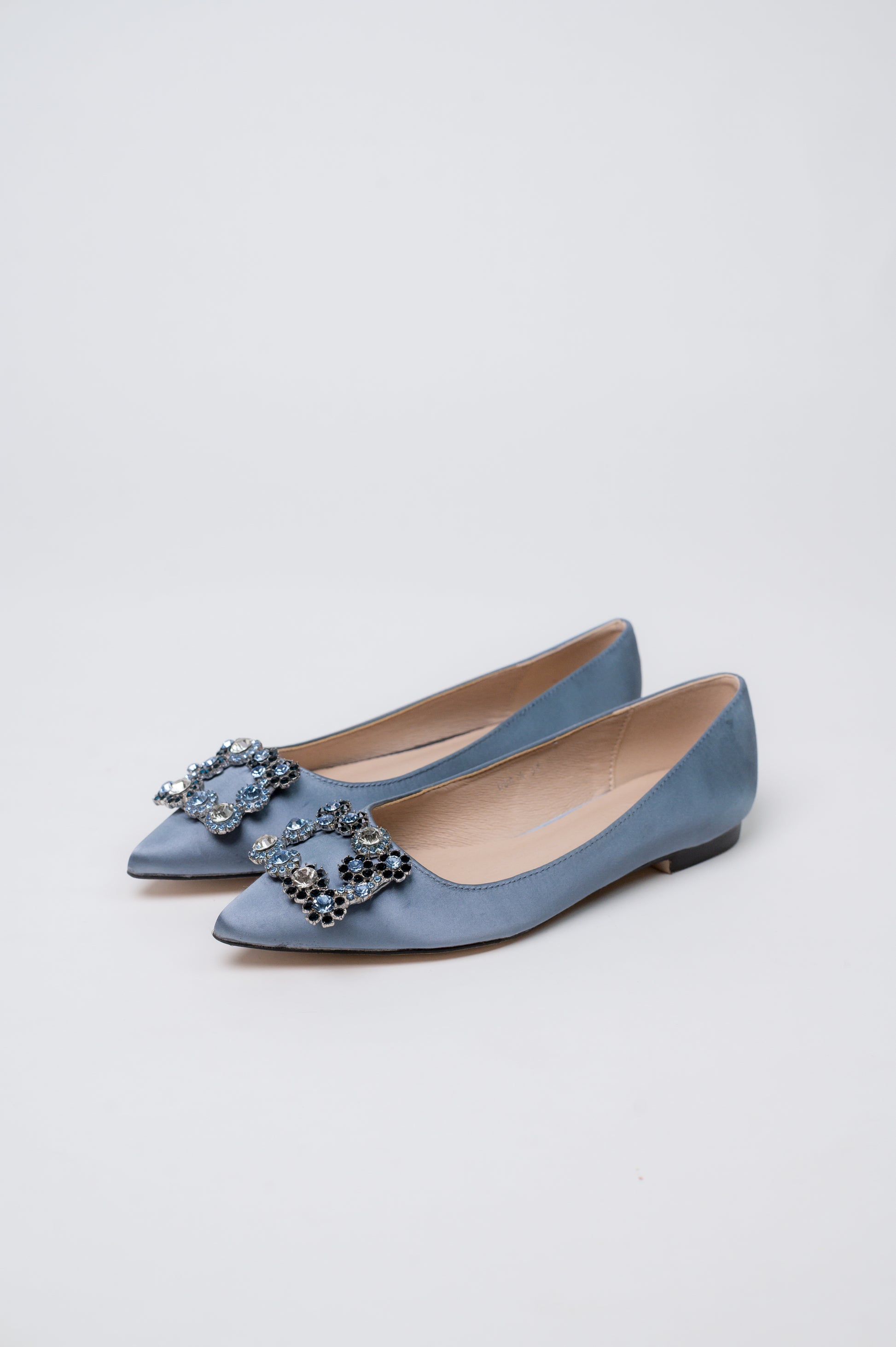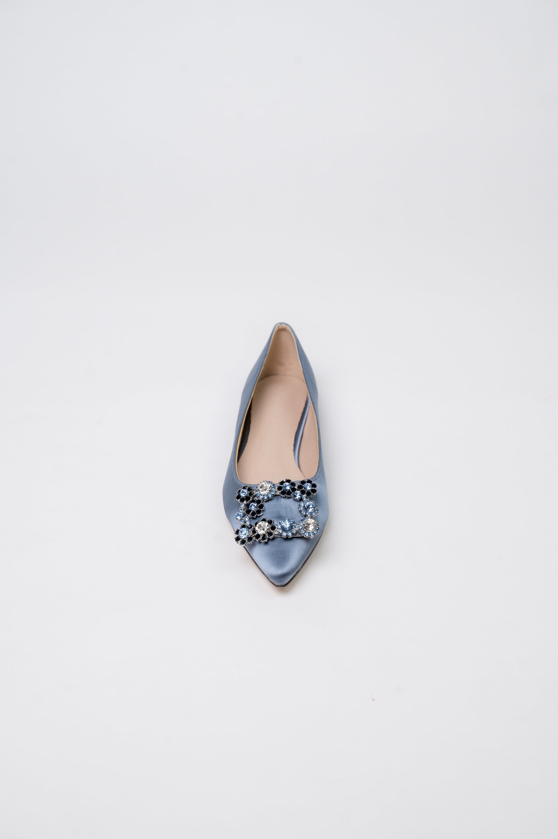 Flats are making a comeback, and we wanted to offer up a flat version of our best-selling MARQUISE. Flower crystal buckle, satin outside, suede leather inside for easy toss-on-and-go vibes. We love how scooped out this shoe is, adding a little glamour to this flat moment!