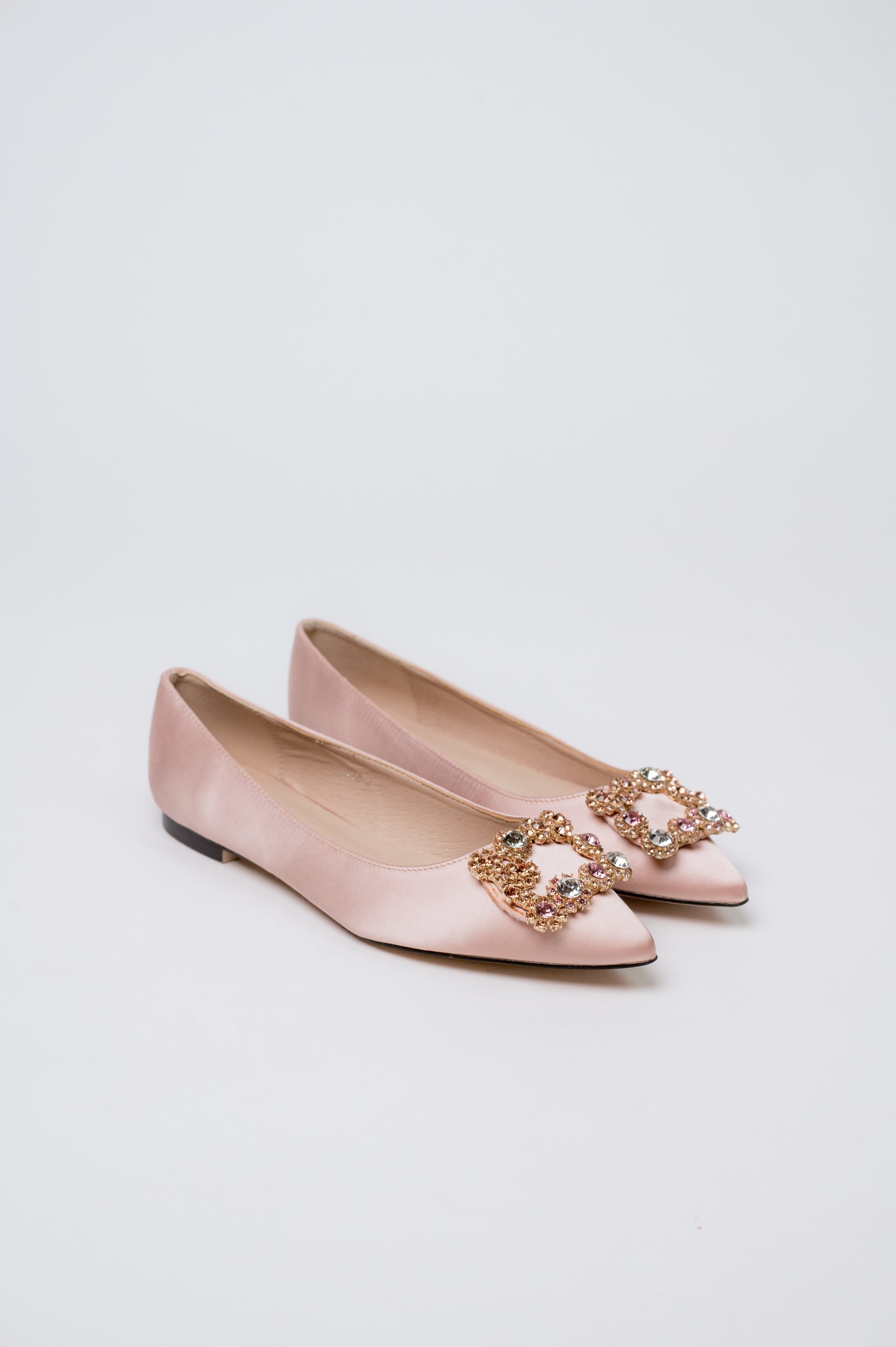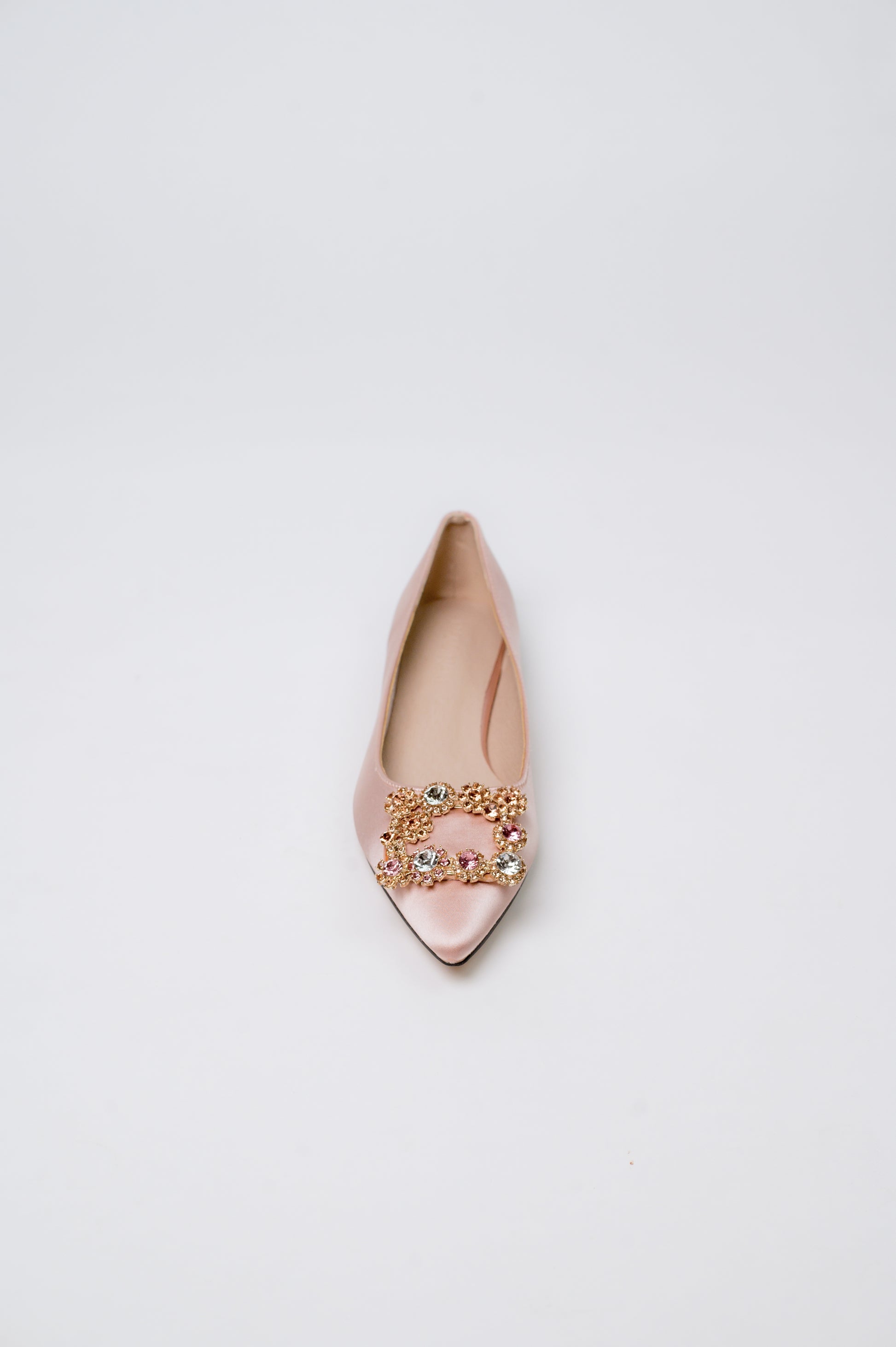Flats are making a comeback, and we wanted to offer up a flat version of our best-selling MARQUISE. Flower crystal buckle, satin outside, suede leather inside for easy toss-on-and-go vibes. We love how scooped out this shoe is, adding a little glamour to this flat moment!