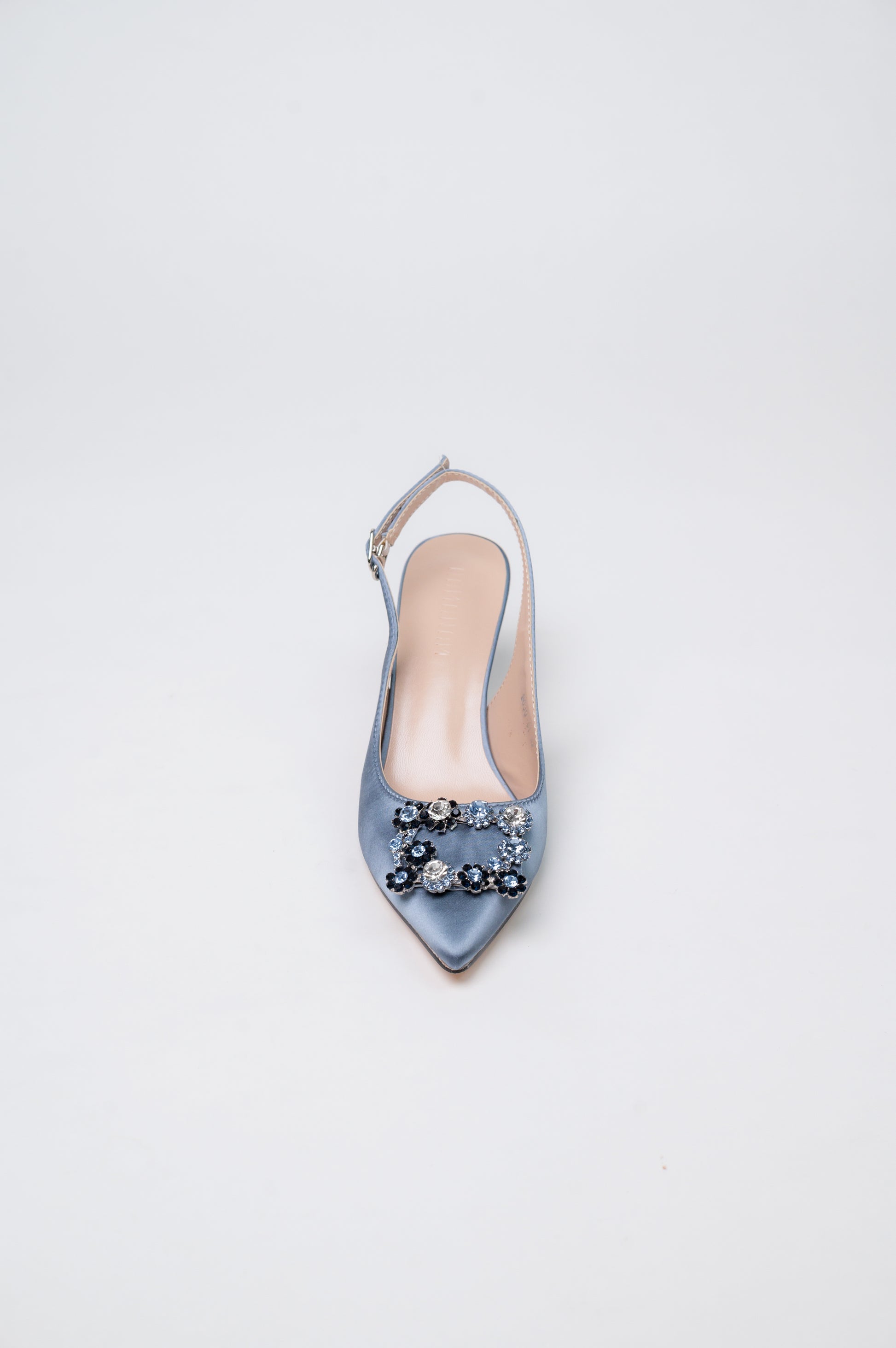 These slingback heels are all about luxury and sparkle. Featuring a pointed toe and a crystal-flower buckle, they add a touch of glam to any outfit.